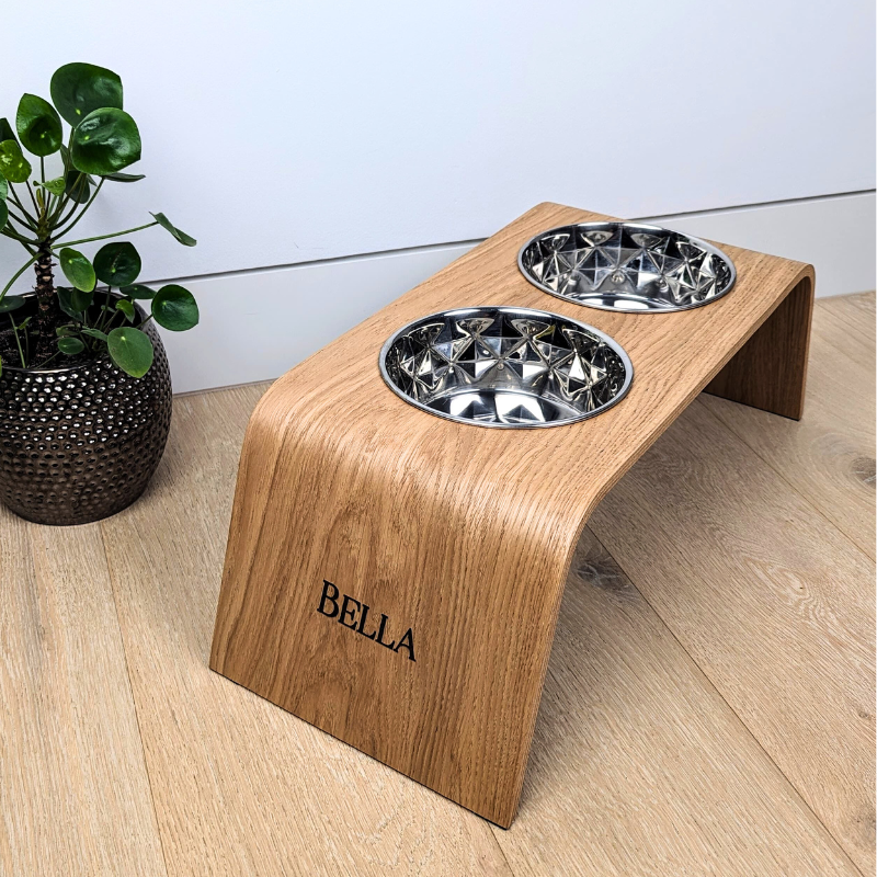 Customize your raised dog bowl stand with a beautifully engraved name plate that makes the feeder truly one of a kind. Simply share your dog’s name, and we’ll craft a clean, elegant engraving that adds personality without disrupting the minimalist design. It’s a small detail that brings a meaningful, personal touch to your pet’s feeding space.