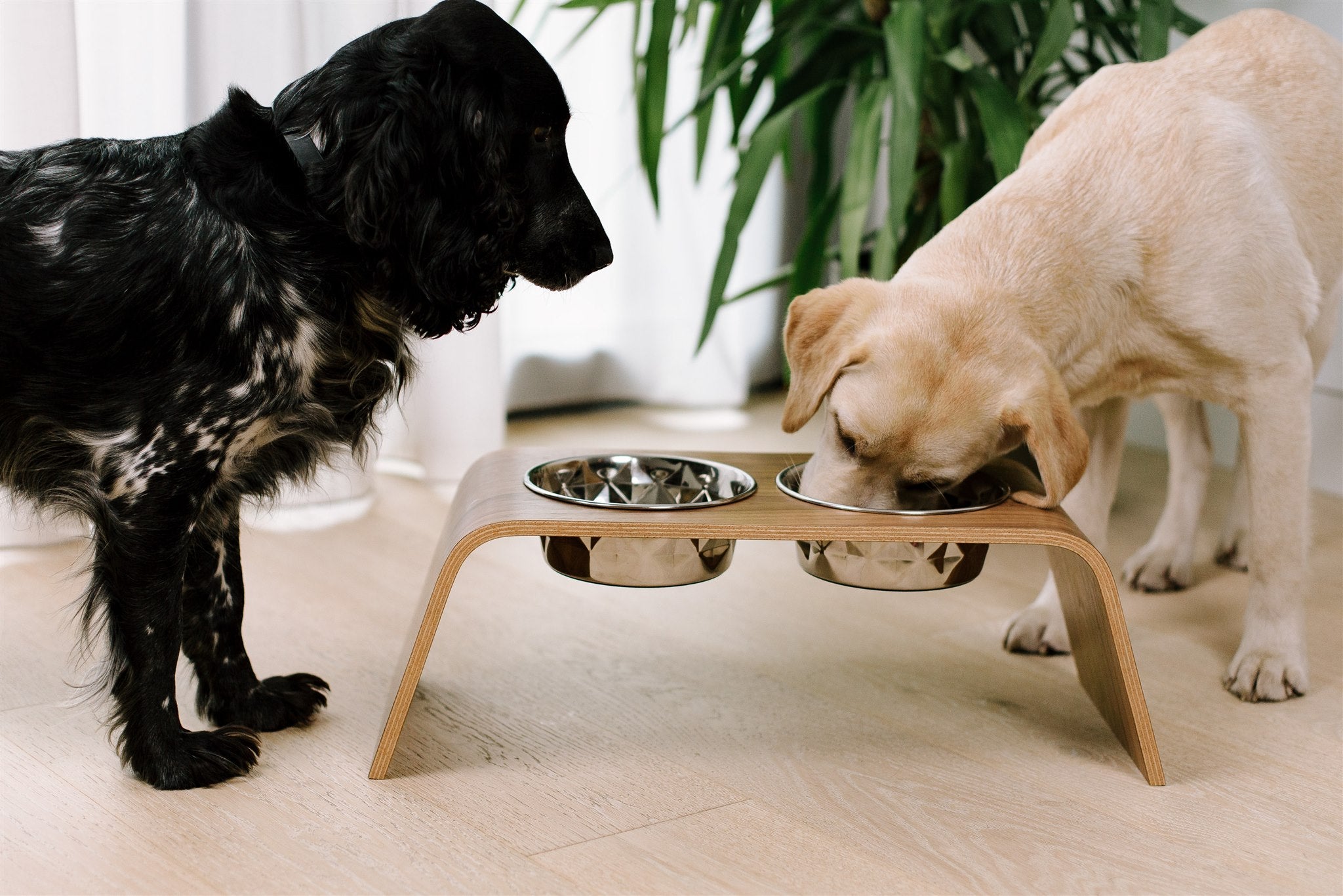 This elevated dog bowl stand is crafted from high-quality plywood and finished with your choice of wood - Natural oak, Black oak, or Walnut, allowing you to match it perfectly to your home interior. The wood is treated with a water-repellent coating, protecting it from spills and splashes. Paired with durable stainless steel bowls, it offers a clean, long-lasting feeding solution designed for both comfort and convenience.